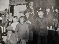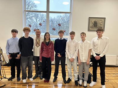 Esimesel fotol õpetaja Jaan Maasikamäe 1940ndatel poistele tööriistu jagamas (Lass, M. “Alavere kooli lood”), teisel ühispildil 9. klassi poisid kooli sünnipäeva külalisesinejate Rute ja Ruslan Trochynskyiga 21. novembril 2025.